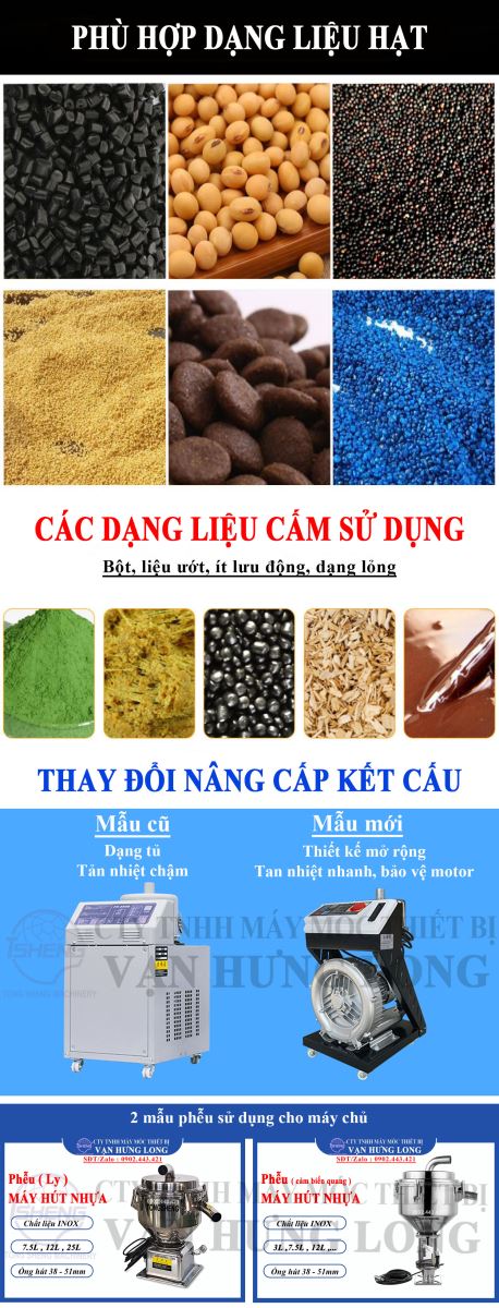 Là thiết bị tự động dùng để vận chuyển hạt nhựa từ thùng chứa (hoặc bao đựng) lên phễu sấy hoặc phễu cấp liệu của máy ép nhựa, máy đùn… Đây là thiết bị không thể thiếu trong các dây chuyền sản xuất nhựa hiện đại, đặc biệt khi sản xuất liên tục và khối lượng lớn.